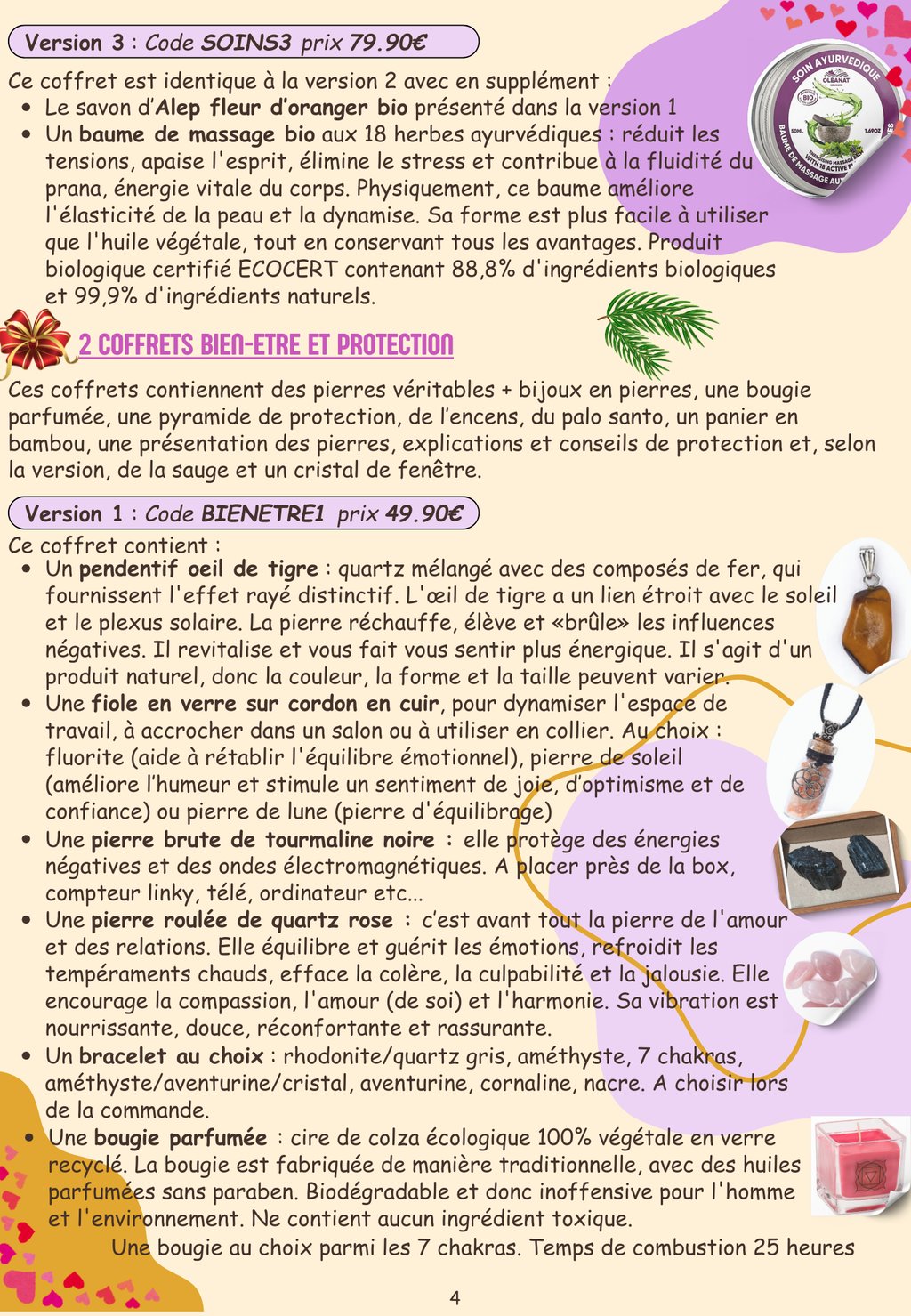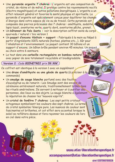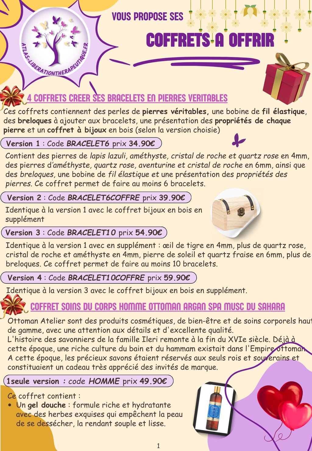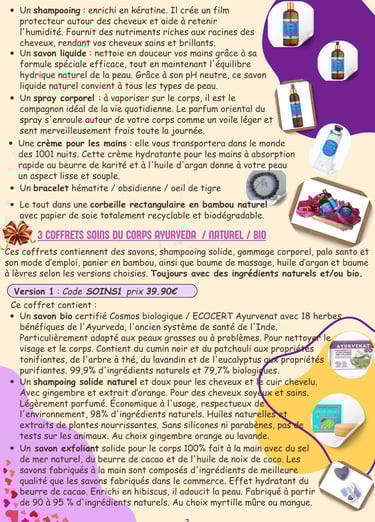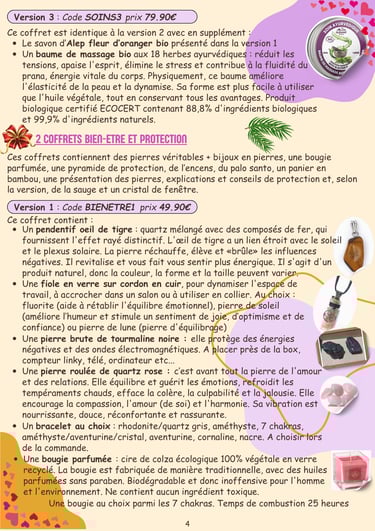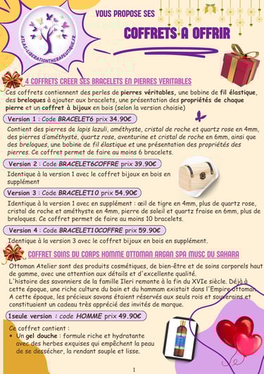 Vous avez le choix entre 4 types de coffrets (créer ses bracelets en pierres véritables, soins du corps homme argan, soins du corps ayurvéda/naturel/bio, bien-être et protection) qui se déclinent en plusieurs versions.